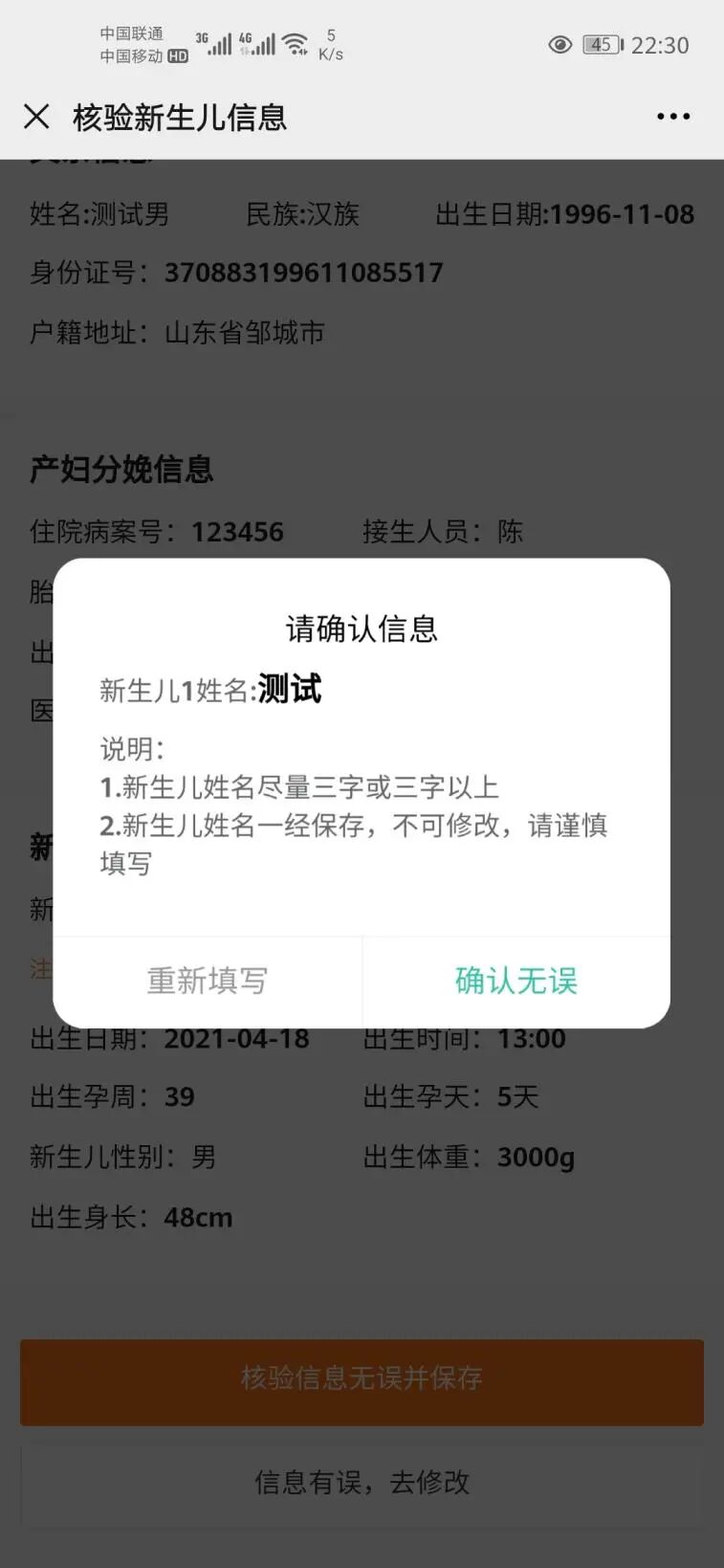 信息无误居民就可以填写新生儿的姓名,在保存的时候会校验规范汉字、第三姓、再次确认填写的姓名是否无误等相关的提示。